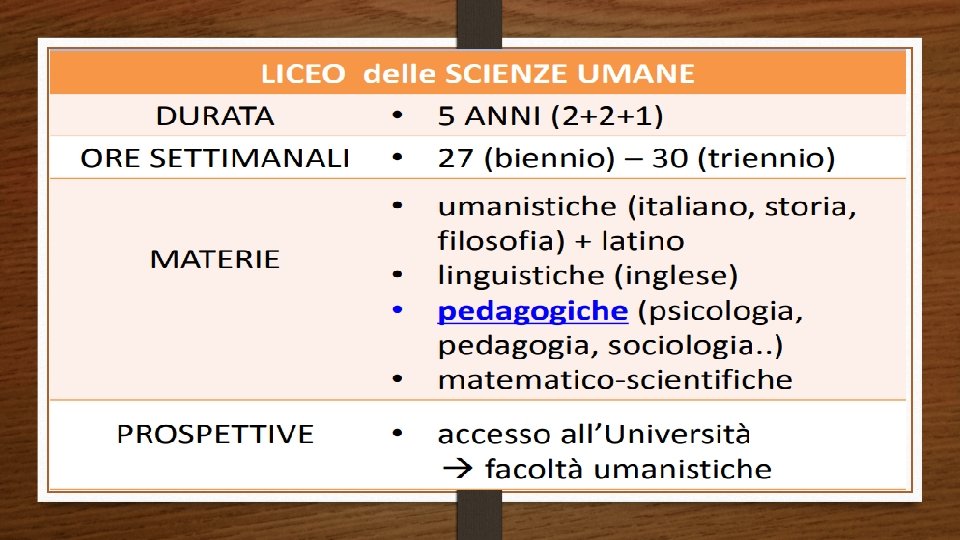 Scegliere il liceo delle scienze umane per • acquisire le conoscenze dei principali campi d’indagine delle scienze umane mediante gli apporti specifici e interdisciplinari della cultura pedagogica, psicologica e socio-antropologica; • raggiungere, attraverso la lettura e lo studio diretto di opere e di autori significativi del passato e contemporanei, la conoscenza delle principali tipologie educative, relazionali e sociali proprie della cultura occidentale e il ruolo da essere svolto nella costruzione della civiltà europea; • saper identificare i modelli teorici e politici di convivenza, le loro ragioni storiche, filosofiche e sociali, e i rapporti che ne scaturiscono sul piano etico-civile e pedagogico-educativo; • saper confrontare teorie e strumenti necessari per comprendere la varietà della realtà sociale, con particolare attenzione ai fenomeni educativi e ai processi formativi, ai luoghi e alle pratiche dell’educazione formale e non, ai servizi alla persona, al mondo del lavoro, ai fenomeni interculturali; • possedere gli strumenti necessari per utilizzare, in maniera consapevole e critica, le principali metodologie relazionali e comunicative, comprese quelle relative alla media education.
