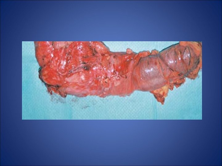 • S-a intervenit chirurgical; intraoperator s-a constat o tumoră cu caractere inflamatorii, de ceco-ascendent şi ileon terminal, cu fistulă ileo -rectală. S-a efectuat rezecţie largă ileală şi hemicolectomie dreaptă cu suprimarea fistulei şi restabilirea continuităţii tubului digestiv