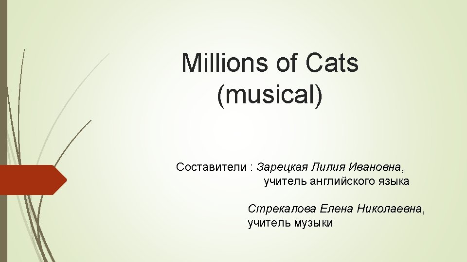 Scene 13 OLD WOMAN: My dear! What are you doing? I asked for one little cat, And what do I see? Cats here, cats there, cats and kittens everywhere, hundreds of cats, thousands of cats, millions and billions and trillions of cats.