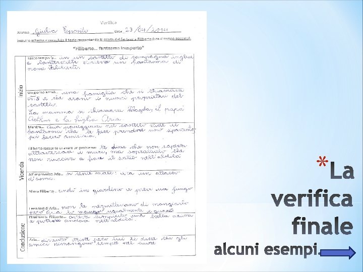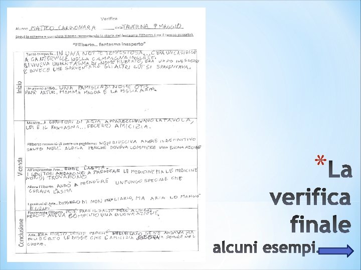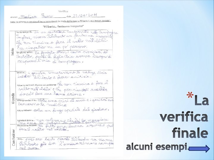 Fase 5 (verifica) *Fornisco ai bambini una scheda strutturata in tabella suddivisa in tre campi (inizio, vicenda, conclusione); all’interno ho inserito alcune parole gancio individuate dagli stessi alunni; fornisco anche una bagaglio di espressioni utili per il completamento del testo da utilizzare liberamente. *Chiedo ora ai bambini di riflettere sul lavoro svolto e riscrivere individualmente la sintesi dell’intero racconto rappresentato a teatro per provare la propria autonomia. *