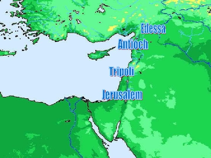 Began in 1096 • Baron’s Crusade – Siege of Antioch • Departure of Byzantines • Peter Bartholomew & Holy Lance – Siege of Jerusalem • Vision of Peter Desidarius • Kingdoms of Jerusalem, Tripoli, Antioch, & Edessa