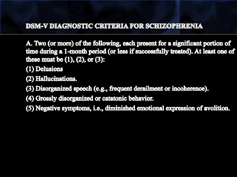 DSM-V DIAGNOSTIC CRITERIA FOR SCHIZOPHRENIFORM DISORDER A. Two (or more) of the following, each present for a significant portion of time during a 1 -month period (or less if successfully treated). At least one of these must be (1), (2), or (3): 1. Delusions 2. Hallucinations 3. Disorganized speech (e. g. , frequent derailment or incoherence) 4. Grossly disorganized or catatonic behavior 5. Negative symptoms (i. e. , diminished emotional expression or avolition).
