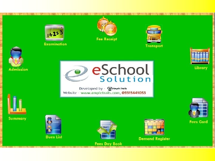 Contact us Computerize your organization from every angle with so simple way. Enjoy the world class latest technology based Eye catching and totally error free Software “e-School” How To Get it Visit www. ampletrails. com Fill the form on any page with your requirement, our experts will contact you or Call us: 09315441053, 09034757673 Email us: info@ampletrails. com