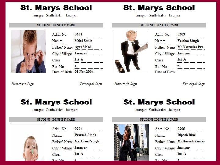 Address Book: Fast Search: Advance Filter Technology Find any record by Name, Adm. No, etc Print Identity Cards Sort Students by any field Wish birthday to Students this month Easy to maintain and Search Birthday’s of Students
