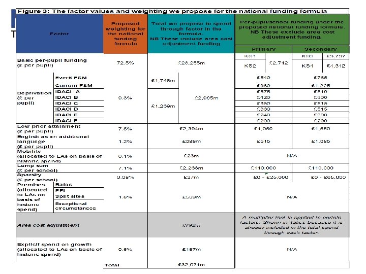 What does the schools NFF look like? q Pupil-led factors § The basic per-pupil factor is 72. 5% (76. 6% currently across all local authorities. § The deprivation factor is 9. 3% (7. 6% currently across all local authorities). § The low prior attainment factor is 7. 5% (4. 3% currently across all local authorities). § The EAL factor is 1. 2% (0. 9% currently across all local authorities). § The mobility factor is 0. 1% (0. 1% currently across all local authorities). q School-led factors § The lump sum factor is 7. 1% (8. 2% currently across all local authorities) – likely to go to small schools. § The sparsity factor is 0. 08% (0. 05% currently across all local authorities) – will go to small schools in largely rural areas. § The premises factor is 1. 8% (1. 8% currently across all local authorities and will be allocated on the basis of historic spend). § The growth factor is 0. 5% (0. 5% currently across all local authorities). School Funding Seminar- March 2017 12