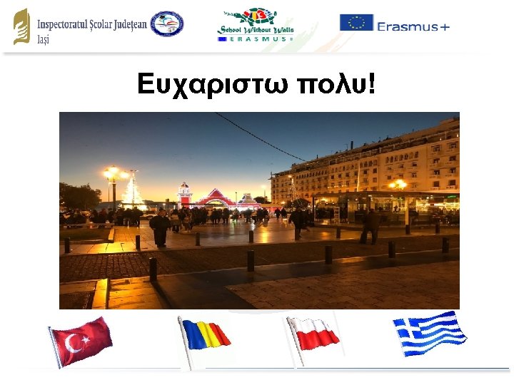 Concluzii Întâlnirea de proiect de la Komotini- Grecia a partenerilor din țările partenere a contribuit la: • realizarea unei comunicări eficiente între parteneri, clarificarea aspectelor importante ( termene, mod de implicare etc. ); • prezentarea activităților specifice, de etapă, organizate de fiecare partener, în vederea atingerii obiectivelor proiectului, • asigurarea unui feed-back al activităților organizate din partea echipei de proiect; • stabilirea etapelor și modalităților ulterioare de realizare a proiectului; • instruirea participanților la întâlnire în vederea implementării activităților practice ale proiectului; • Schimb de experiență și interacțiuni educaționale, lingvistice și culturale echipelor de proiect din țările participante.