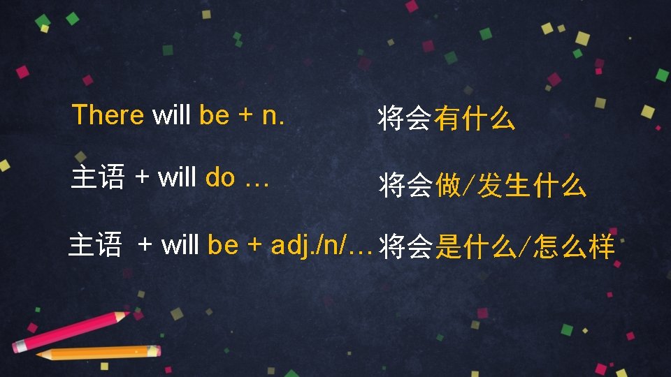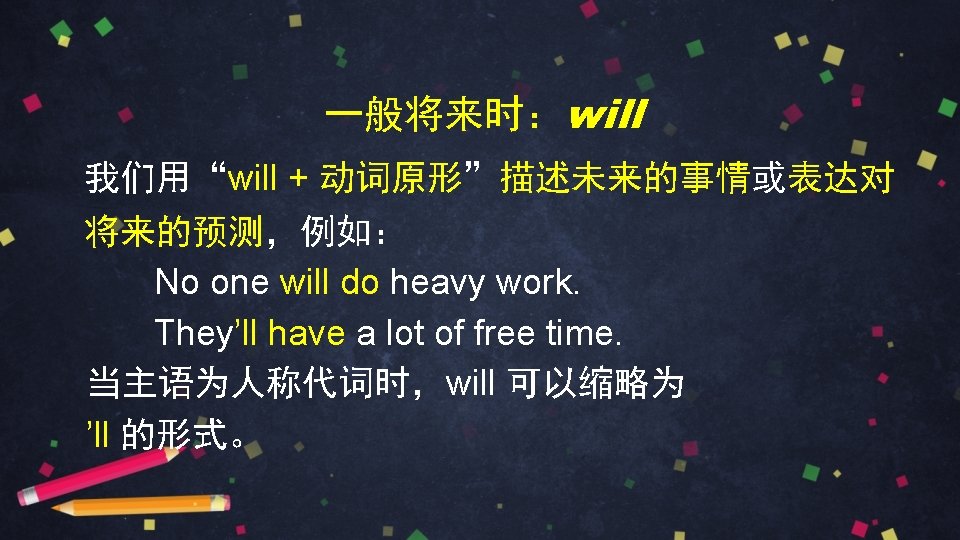 一般将来时:will 如果要询问将来的事,把will提到主语前面,变成疑 问句。一般疑问句回答用will或者won’t。例如: — Will students go to school in the future? — Yes, they will. / No, they won’t. How will things change in the future?