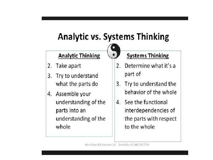Systems thinking • The essence of systems thinking is to focus on the whole. • The parts are no longer the primary focus. The parts are essential, but what is more important is the interrelationship between the parts as they work together to fulfill the purpose of the whole system. • Systems thinking is a purpose/outcome-oriented approach of thinking that is very different from the piecemeal and fragmented approach we often use. • Even though our universe is “held together” by systems, ironically, we continually break things apart, to look at the pieces and lose whatever sight we had of the whole. That process, known as analytical thinking, makes the parts primary and the whole secondary. • In systems thinking, the whole is primary and the parts, secondary. This is not only a holistic and strategic way of viewing an organization, it can transform the way people interact. •