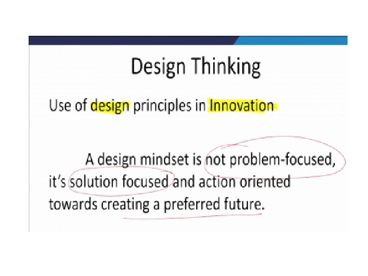 • Thinking like a designer brings together what is desirable from a human point of view with what is technologically feasible and economically viable. • A design mindset is not problem-focused, it’s solution -focused and action-oriented. It involves both analysis and imagination. • Design thinking draws on logic, imagination, intuition and systemic reasoning to explore the possibilities of what could be and to create desired outcomes that benefit the end user (the customer).