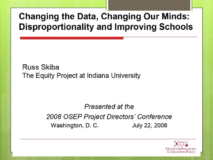 Examining Provide opportunities for teachers and administrators to examine their own potential biases related to research on disproportionality Know yourself Know your students Review your personal data Referrals Responses to problem behavior & likelihood to engage/escalate