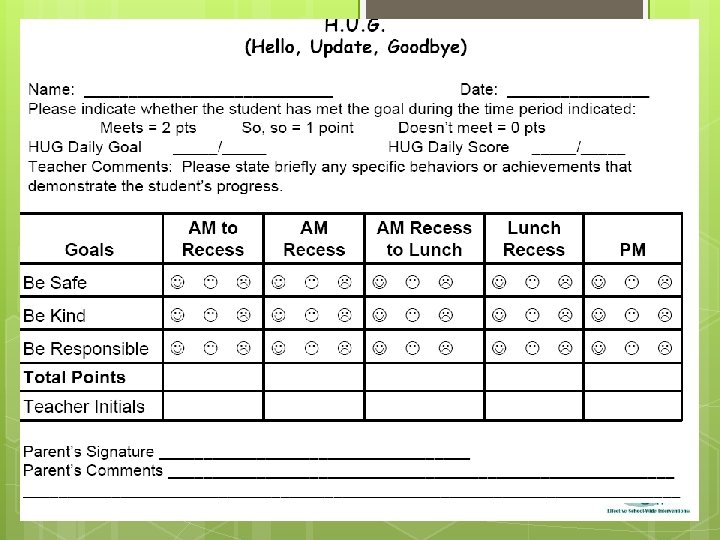 Example: Lucy has been on CICO for 3. 5 months; she has earned 90% of points each week for the last 10 weeks Coordinator provides rationale for self monitoring to Lucy Coordinator teaches Lucy to self monitor using examples and non-examples When program begins, Lucy’s teacher goes over examples and nonexamples First week: Lucy and teacher monitor and compare records Second week Teacher provides acknowledgement and feedback based on accuracy Ratings agree 95% of time Teacher monitors appx. 60% of time; feedback based on accuracy Feedback at other times based on Lucy’s monitoring of Behaviour Coordinator Feedback based on accuracy (with teacher records) When Lucy monitors independently, feedback based on Behaviour