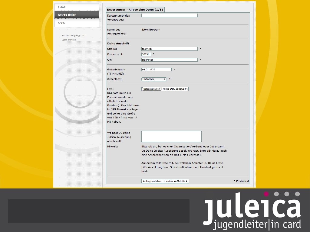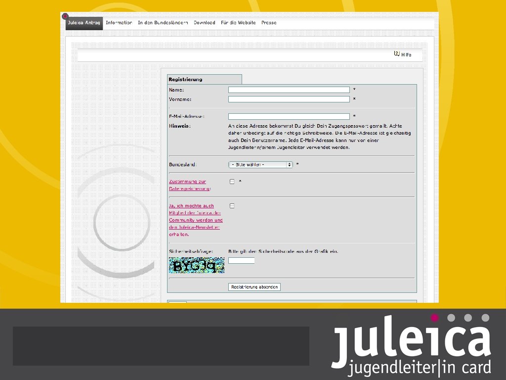 Der Weg zur Juleica Schritt 3: Online-Antrag stellen • Du rufst im Internet die Adresse www. juleica. de auf und klickst auf der Startseite auf „Hier beantragen“ Als erstes musst du Dich registrieren und Du erhältst einen Passwort. Dann geht es los und du kannst den Antrag stellen. Wichtig ist, dass du den richtigen Träger angibst. Dies ist deine Ortsgruppe, in der du Jugendarbeit machst. Du klickst das Bundesland an, dann den Ort und es erscheinen alle Jugendverbände und Kirchengemeinden, die dort Jugendarbeit machen. Klick deinen Verband/deine Kirchengemeinde an und weiter geht’s. Wenn du alles fertig ausgefüllt und geprüft hast, schick den Antrag los. Wenn dein Antrag geprüft wurde, wird die Karte gedruckt & verschickt. Du bekommst jeweils per E-Mail eine Information. Auf den folgenden Seiten gibt es eine „Schritt-für-Schritt-Anleitung“ die dir den Weg zur Juleica ausführlich erklärt!