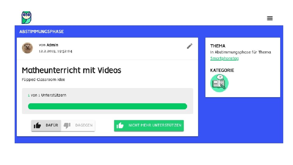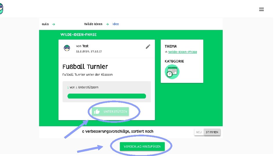 Aufgaben: • Anmelden und ein neues Passwort vergeben • Einen Verbesserungsvorschlag schreiben • Eine wilde Idee erstellen • Eigene Idee verändern • Eine Idee unterstützen • Über ein Thema abstimmen