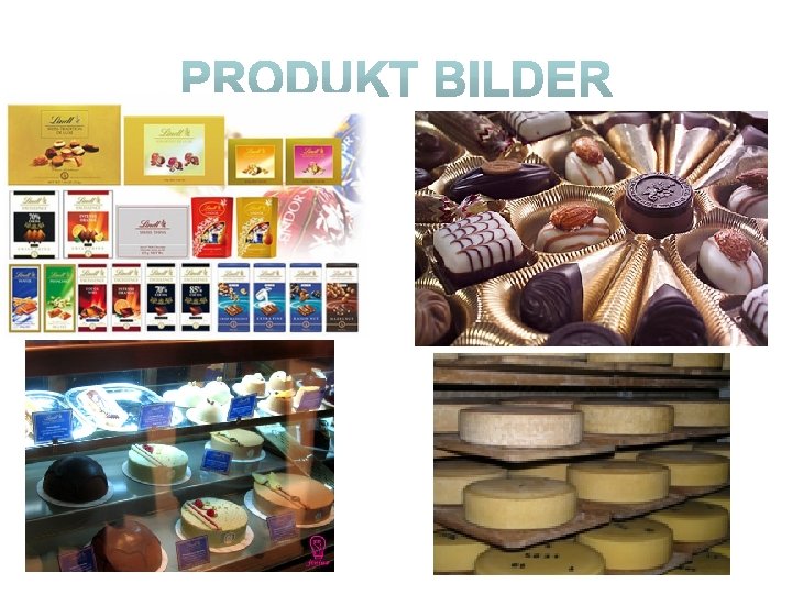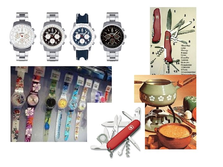 SCHWEIZER PRODUKTE • • • Sehr beliebte Schweizer Produkte sind: Schweizer Käse Schweizer Schokolade Schweizer Messer Schweizer Uhr Zu lokalen Spezialitäten gehören etwa: Zuger Kirschtorte Appenzeller Biber die Aargauer Rüeblitorte Basler Läckerli