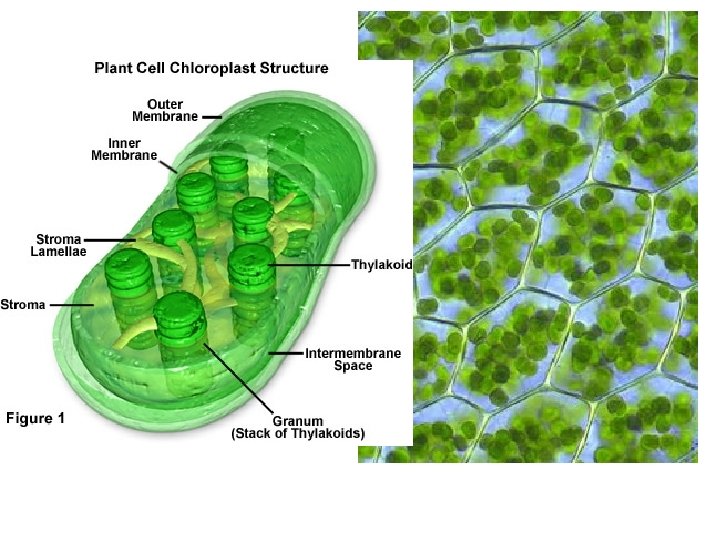 The Chloroplast • An organelle in plant cells where photosynthesis occurs. • Contains a green pigment called chlorophyll. • Easy to see because of green colour. • Found in ground tissue of leaves and sometimes in stems.