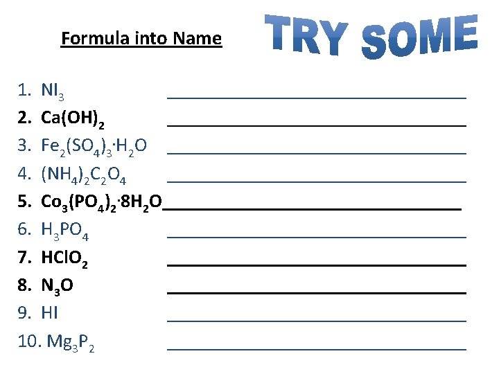 Name into Formula 1. Silver chloride_____ 2. Sulphur dioxide_____ 3. Lead (II) acetate decahydrate________ 4. Silver dichromate_____ 5. Silicon tetraflouride_____ 6. Ammonium phosphate _____ 7. Copper (I) iodide_____ 8. Iron (II) fluoride nonahydrate_______ 9. Zinc hydrogen sulphite_______ 10. Manganese (IV) monohydrogen phosphate trihydrate ________