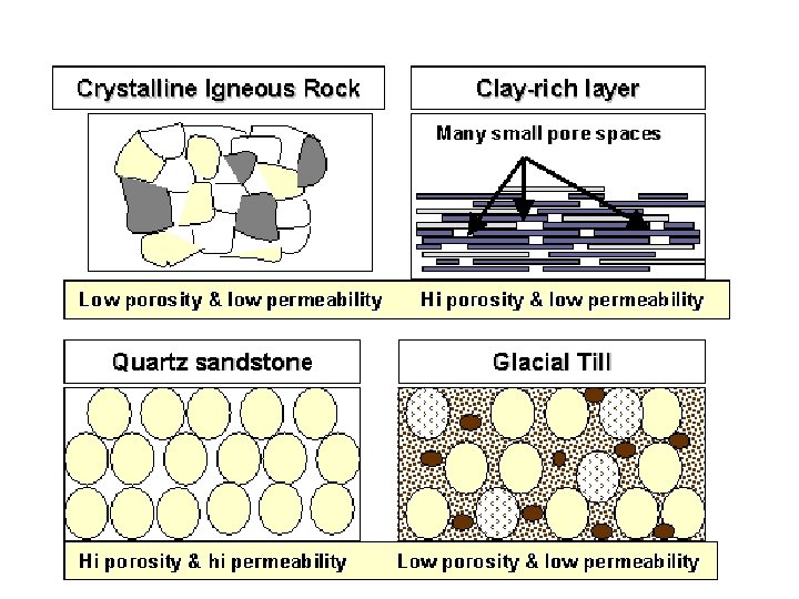 Porosity and Permeability • Porosity The amount of empty space in soil or a rock. • Permeability The measure of how easily liquids and gases pass through a soil or a rock