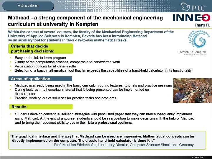 Science and Education Successful Deployment of Mathcad for Process Technology Studies at HTW The School of Engineering at the University of Applied Sciences (HTW) in Saarland, Germany offers courses of study for Bachelor and Masters programs in Process Technology (Electrical and Process Engineering). Included in these programs are the planning, development, construction, and operation involved in Power Plant, Environmental, and Process Engineering. BUSINESS INITIATIVE § In the course of a studies reform finalized in 2005, HTW determined to strengthen and enhance the inclusion of computer-aided methods and procedures in the curriculum. In order to cover the complete spectrum, the implementation of a universal Software Solution was planned for solving all areas of problems in Mathematics, Natural Science, Technical and Business Management already included in the Core Curriculum. SOLUTION § § Mathcad was ideally suited to become this universally usable tool. Because the notation in Mathcad largely conforms to Mathematical notation, after learning the simple rules for editing of equations, the students already have a sense of accomplishment. The validation of syntax and consistency of units that Mathcad performs as part of equation editing makes mistakes immediately apparent. On the worksheet the students receive a clear record of edited problems. Immediately retrievable graphic representations of the results support the vivid visual nature of the solution. RESULTS § Mathcad has already been implemented with elementary exercises for core studies; for advanced studies the application was expanded for complex construction simulation – the possibilities with Mathcad are practically endless. § Through matrix-based Computer Algebra and through programming in the form of structured program blocks, the solutions for complex statements of problems are clearly and easily achieved. § At the conclusion of their studies, students are capable of independently developing simulations for R&D activities and they later bring this expertise to their careers. “Since the 1990’s, during my career I’ve gathered programming experience in FORTRAN. The implementation of Mathcad proceeded rapidly and effortlessly, and I am continually impressed with how quickly and elegantly solutions can be achieved with this tool. ” - Prof. Dr. -Ing. Michael Reimann 1 © 2008 PTC