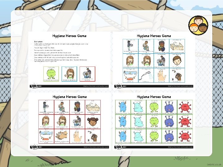 Shuffle together all the Hygiene Hero and Oh No! Game Cards and place them face down in the middle, between all the players. Give each player 2 Germ Gang Tokens. The player who has had the most recent birthday goes first. Take turns picking up a Game Card from the pile. Read the card aloud. If you picked up a Hygiene Hero Card, you can discard one of your Germ Gang Tokens. If you picked up an Oh No! Card, pick up a Germ Gang Token and add it to your pile. When all the Game Cards have been used, count your Germ Gang Tokens. The person with the fewest Germ Gang Tokens is today’s Hygiene Hero!