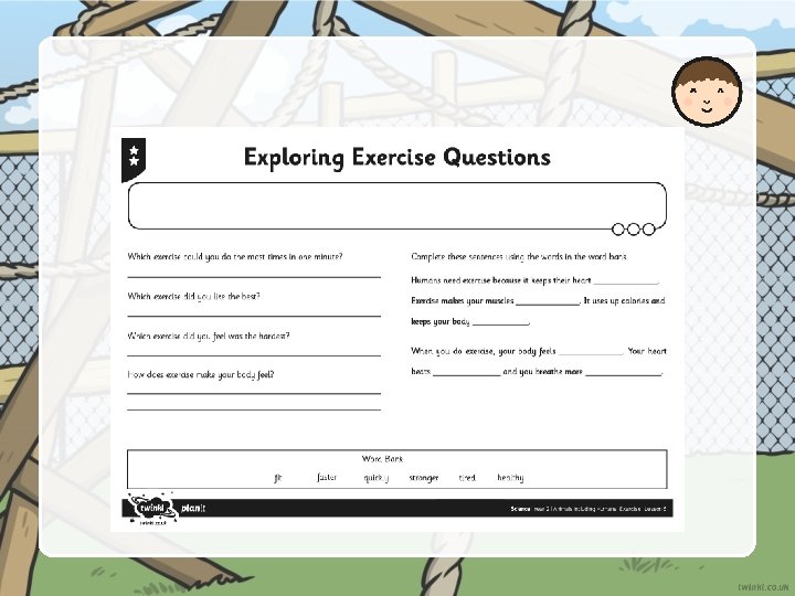 • I can give reasons why humans need to exercise. • I can gather information and use it to answer a question. • I can say a reason why humans need to exercise. • I can say one effect that exercise has on the human body. • I can record information about exercise. • I can use the information to answer questions.