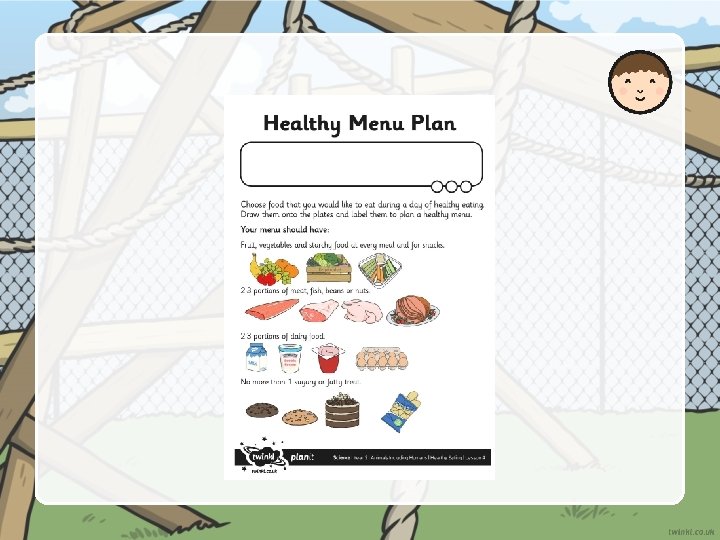 Think about what you have learned today. You are going to design a menu for day of healthy eating. You need to include: Fruit, vegetables and starchy food at every meal and for snacks. 2 3 portions of meat, fish, beans or nuts. 2 3 portions of dairy food. No more than 1 sugary or fatty treat.
