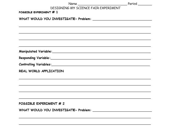 REMEMBER YOU NEED: SAMPLE DUE DATES AT LEAST FIVE MEANINGFUL PICTURES SHOWING EXPERIMENT PRINTED OUT TO PUT ON YOUR BOARD IN THE PROCEDURE SECTION AT LEAST 30 TESTS CONDUCTED Friday, NOV 22 PROBLEM ALL MUST BE TYPED HYPOTHESIS VARIABLES MATERIALS PROCEDURE- UPDATED WITH OLD PAPERS STAPPLED TO BACK Wed, Dec. 4 MON, JAN. 13 Mon, Jan 13 Mon. , Jan. 13 DATA page ---- Blank Data Table NO DATA JUST HEADINGS - NO NUMBERS UNLESS YOU ARE DONE (CHECKING THE LAYOUT OF YOUR DATA TABLE) HANDWRITTEN record of your observations and measurements. MUST HAVE AT LEAST 30 TESTS CONDUCTED DATA page --- Data Table with Data typed in ACKNOWLEDGEMENTS CONCLUSION