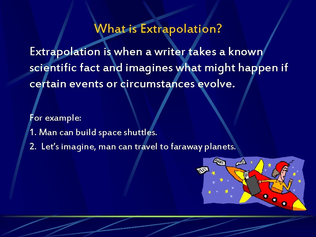 What is Extrapolation? Extrapolation is when a writer takes a known scientific fact and imagines what might happen if certain events or circumstances evolve. For example: 1. Man can build space shuttles. 2. Let’s imagine, man can travel to faraway planets.
