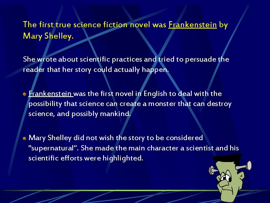 The first true science fiction novel was Frankenstein by Mary Shelley. She wrote about scientific practices and tried to persuade the reader that her story could actually happen. Frankenstein was the first novel in English to deal with the possibility that science can create a monster that can destroy science, and possibly mankind. Mary Shelley did not wish the story to be considered "supernatural“. She made the main character a scientist and his scientific efforts were highlighted.