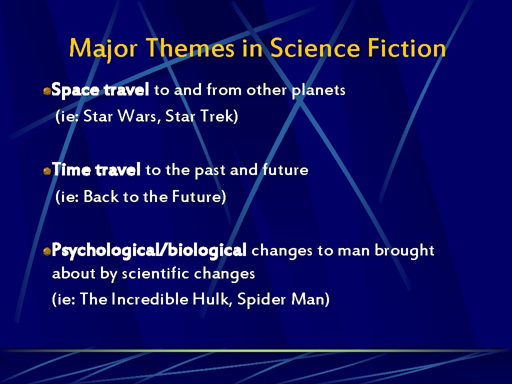 Major Themes in Science Fiction Space travel to and from other planets (ie: Star Wars, Star Trek) Time travel to the past and future (ie: Back to the Future) Psychological/biological changes to man brought about by scientific changes (ie: The Incredible Hulk, Spider Man)