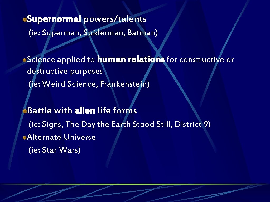 Supernormal powers/talents (ie: Superman, Spiderman, Batman) Science applied to human relations for constructive or destructive purposes (ie: Weird Science, Frankenstein) Battle with alien life forms (ie: Signs, The Day the Earth Stood Still, District 9) Alternate Universe (ie: Star Wars)