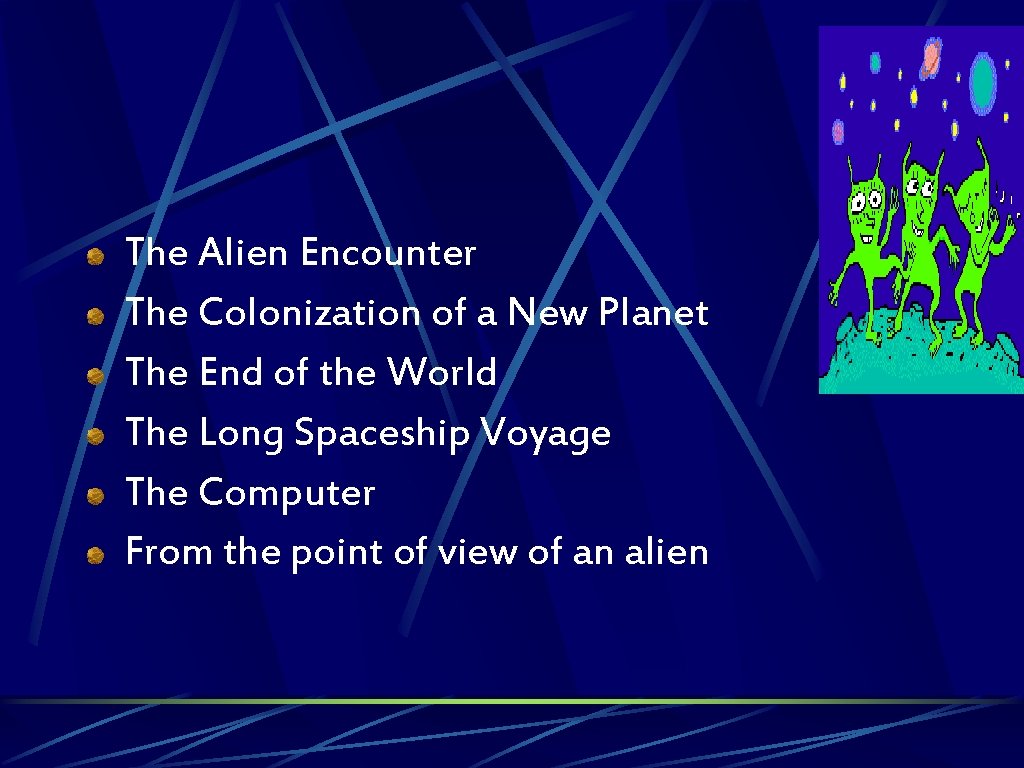 The Alien Encounter The Colonization of a New Planet The End of the World The Long Spaceship Voyage The Computer From the point of view of an alien