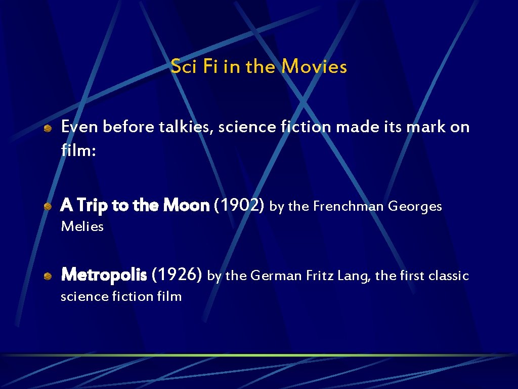 Sci Fi in the Movies Even before talkies, science fiction made its mark on film: A Trip to the Moon (1902) by the Frenchman Georges Melies Metropolis (1926) by the German Fritz Lang, the first classic science fiction film