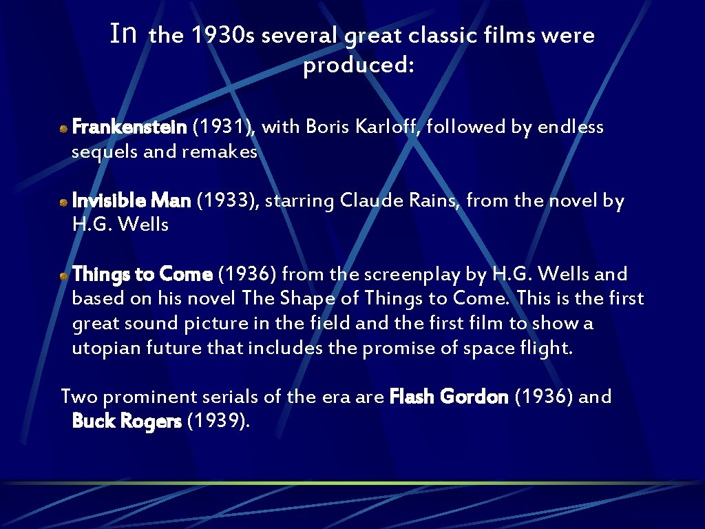 In the 1930 s several great classic films were produced: Frankenstein (1931), with Boris Karloff, followed by endless sequels and remakes Invisible Man (1933), starring Claude Rains, from the novel by H. G. Wells Things to Come (1936) from the screenplay by H. G. Wells and based on his novel The Shape of Things to Come. This is the first great sound picture in the field and the first film to show a utopian future that includes the promise of space flight. Two prominent serials of the era are Flash Gordon (1936) and Buck Rogers (1939).