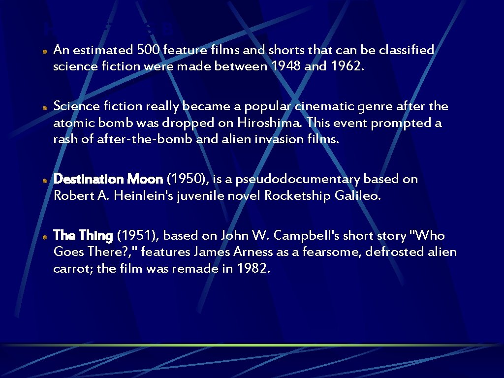 HE FIFTIES B An estimated 500 feature films and shorts that can be classified science fiction were made between 1948 and 1962. Science fiction really became a popular cinematic genre after the atomic bomb was dropped on Hiroshima. This event prompted a rash of after-the-bomb and alien invasion films. Destination Moon (1950), is a pseudodocumentary based on Robert A. Heinlein's juvenile novel Rocketship Galileo. The Thing (1951), based on John W. Campbell's short story "Who Goes There? , " features James Arness as a fearsome, defrosted alien carrot; the film was remade in 1982.