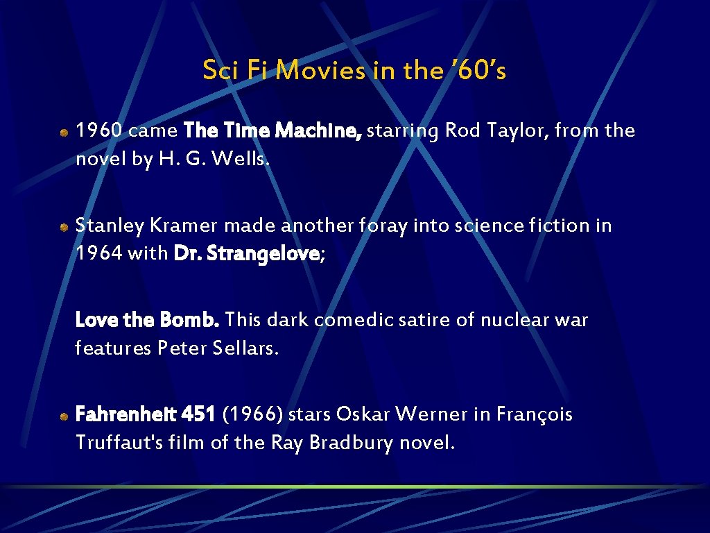 Sci Fi Movies in the ’ 60’s 1960 came The Time Machine, starring Rod Taylor, from the novel by H. G. Wells. Stanley Kramer made another foray into science fiction in 1964 with Dr. Strangelove; Love the Bomb. This dark comedic satire of nuclear war features Peter Sellars. Fahrenheit 451 (1966) stars Oskar Werner in François Truffaut's film of the Ray Bradbury novel.