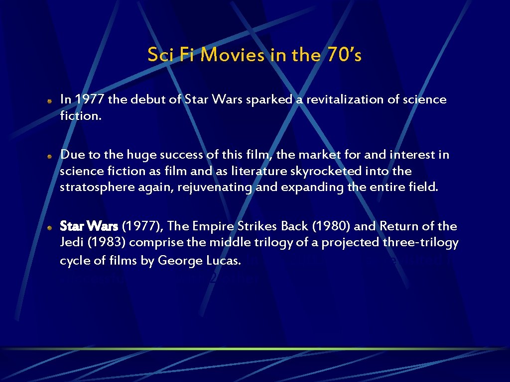 Sci Fi Movies in the 70’s In 1977 the debut of Star Wars sparked a revitalization of science fiction. Due to the huge success of this film, the market for and interest in science fiction as film and as literature skyrocketed into the stratosphere again, rejuvenating and expanding the entire field. Star Wars (1977), The Empire Strikes Back (1980) and Return of the Jedi (1983) comprise the middle trilogy of a projected three-trilogy cycle of films by George Lucas. In the 2000’s, Lucas revisited his successful series with 2 other