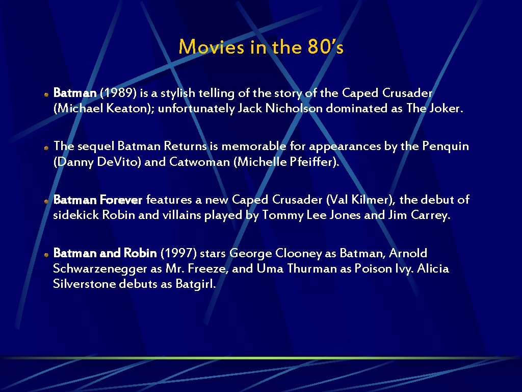 Movies in the 80’s Batman (1989) is a stylish telling of the story of the Caped Crusader (Michael Keaton); unfortunately Jack Nicholson dominated as The Joker. The sequel Batman Returns is memorable for appearances by the Penquin (Danny De. Vito) and Catwoman (Michelle Pfeiffer). Batman Forever features a new Caped Crusader (Val Kilmer), the debut of sidekick Robin and villains played by Tommy Lee Jones and Jim Carrey. Batman and Robin (1997) stars George Clooney as Batman, Arnold Schwarzenegger as Mr. Freeze, and Uma Thurman as Poison Ivy. Alicia Silverstone debuts as Batgirl.