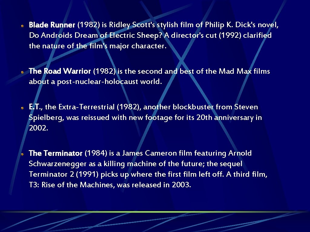 Blade Runner (1982) is Ridley Scott's stylish film of Philip K. Dick's novel, Do Androids Dream of Electric Sheep? A director's cut (1992) clarified the nature of the film's major character. The Road Warrior (1982) is the second and best of the Mad Max films about a post-nuclear-holocaust world. E. T. , the Extra-Terrestrial (1982), another blockbuster from Steven Spielberg, was reissued with new footage for its 20 th anniversary in 2002. The Terminator (1984) is a James Cameron film featuring Arnold Schwarzenegger as a killing machine of the future; the sequel Terminator 2 (1991) picks up where the first film left off. A third film, T 3: Rise of the Machines, was released in 2003.