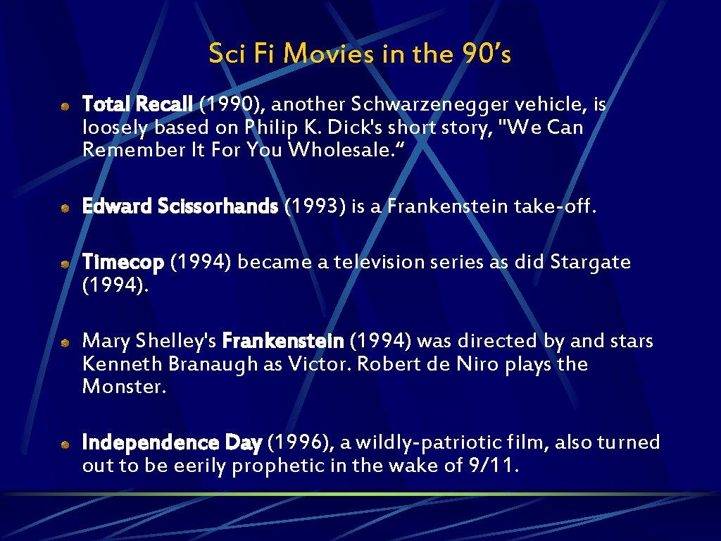 Sci Fi Movies in the 90’s Total Recall (1990), another Schwarzenegger vehicle, is loosely based on Philip K. Dick's short story, "We Can Remember It For You Wholesale. “ Edward Scissorhands (1993) is a Frankenstein take-off. Timecop (1994) became a television series as did Stargate (1994). Mary Shelley's Frankenstein (1994) was directed by and stars Kenneth Branaugh as Victor. Robert de Niro plays the Monster. Independence Day (1996), a wildly-patriotic film, also turned out to be eerily prophetic in the wake of 9/11.