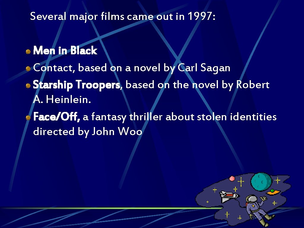 Several major films came out in 1997: Men in Black Contact, based on a novel by Carl Sagan Starship Troopers, based on the novel by Robert A. Heinlein. Face/Off, a fantasy thriller about stolen identities directed by John Woo