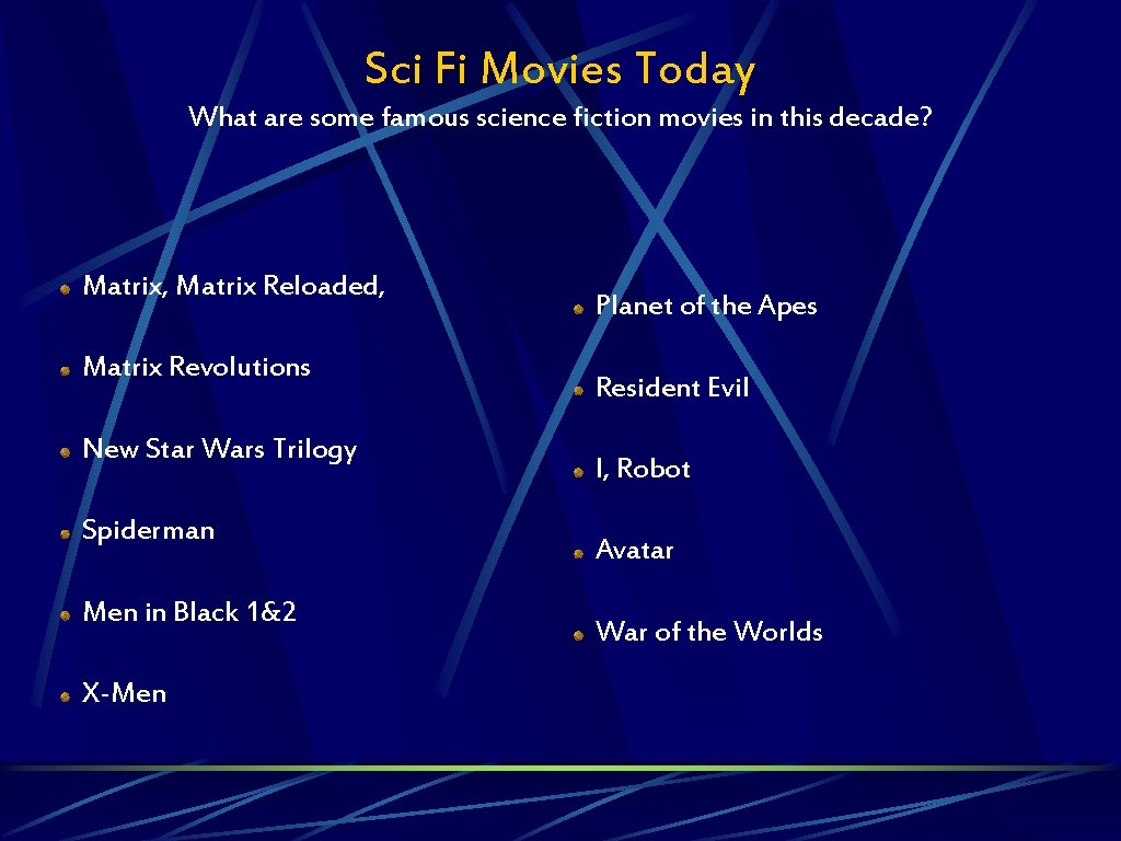 Sci Fi Movies Today What are some famous science fiction movies in this decade? Matrix, Matrix Reloaded, Matrix Revolutions New Star Wars Trilogy Spiderman Men in Black 1&2 X-Men Planet of the Apes Resident Evil I, Robot Avatar War of the Worlds