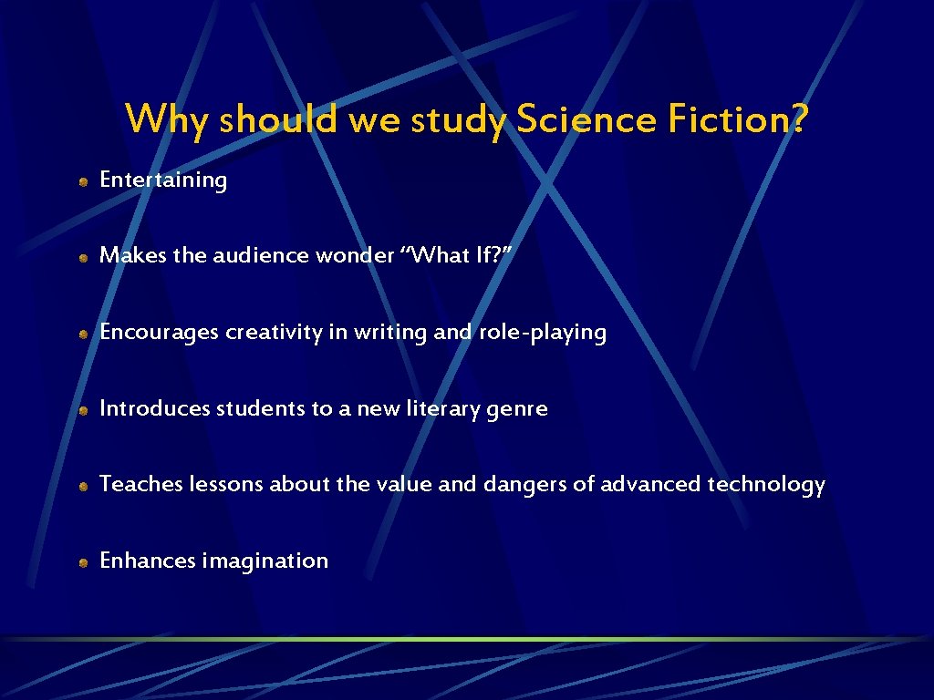 Why should we study Science Fiction? Entertaining Makes the audience wonder “What If? ” Encourages creativity in writing and role-playing Introduces students to a new literary genre Teaches lessons about the value and dangers of advanced technology Enhances imagination