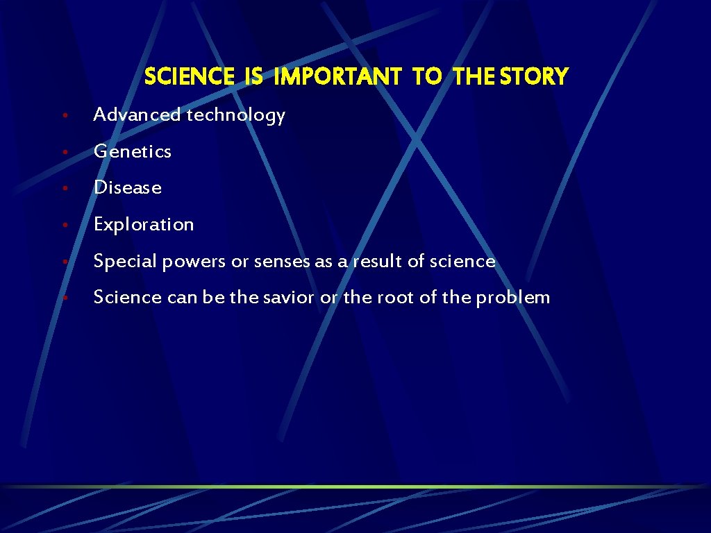 SCIENCE IS IMPORTANT TO THE STORY • Advanced technology • Genetics • Disease • Exploration • Special powers or senses as a result of science • Science can be the savior or the root of the problem