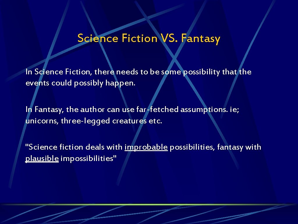 Science Fiction VS. Fantasy In Science Fiction, there needs to be some possibility that the events could possibly happen. In Fantasy, the author can use far-fetched assumptions. ie; unicorns, three-legged creatures etc. "Science fiction deals with improbable possibilities, fantasy with plausible impossibilities"