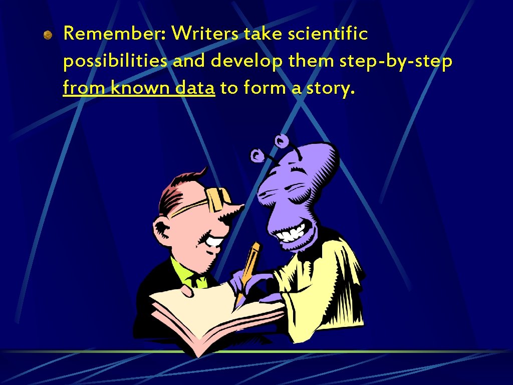 Remember: Writers take scientific possibilities and develop them step-by-step from known data to form a story.