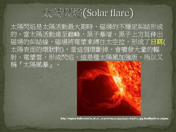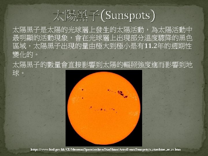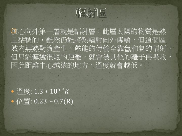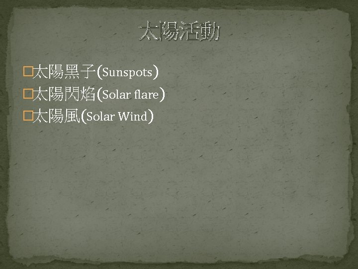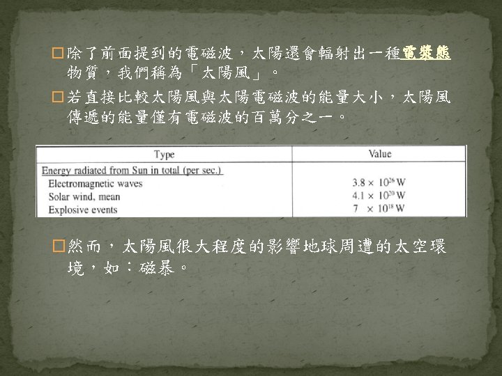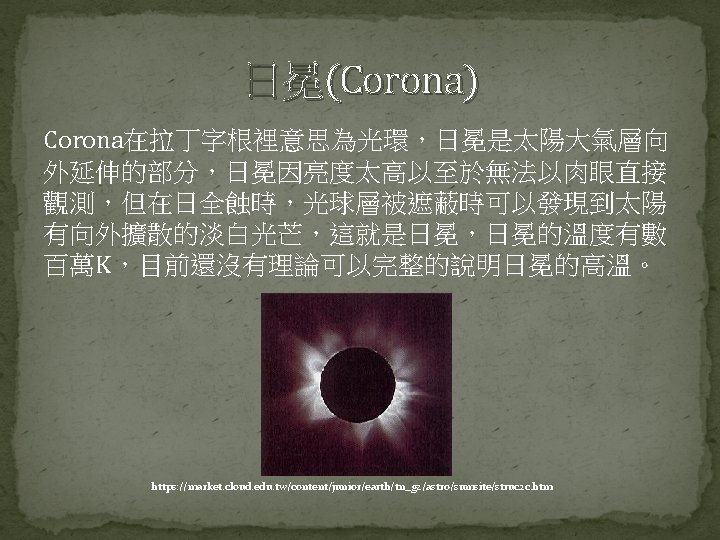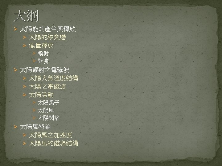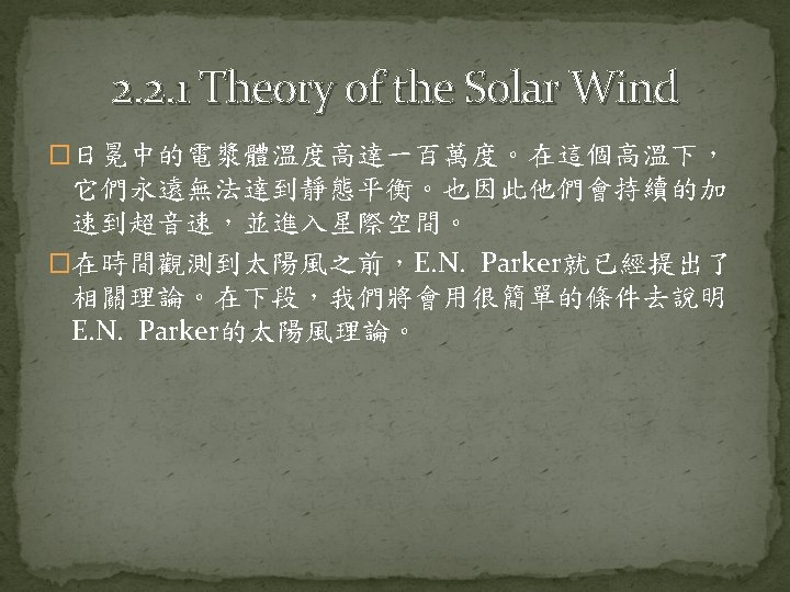 Science of Space Environment Chapter 2 The Sun Slides: 44 Download presentation Science of Space Environment Chapter 2: The Sun and the Solar wind 許祐齊 楊孟澤 諸恩平 指導老師: 劉正彥 吳郁娟 太陽能的產生與釋放 https: //www. lcsd. gov. hk/CE/Museum/Space/archive/Education. Resource/Universe/framed_e/lecture/ch 11/inter_sun. html 核融合(D-T Nuclear Fusion) https: //www. vectorstock. com/royalty-free-vector/diagram-showing-nuclear-fusion-vector-9715810 核融合(D-D Nuclear Fusion) https: //commons. wikimedia. org/wiki/File: Proton-proton_reaction_chain. svg 能量輻射 � https: //zi. media/@yidianzixun/post/5 g 3 p 7 w 輻射區 http: //www. passmyexams. co. uk/GCSE/physics/structure-of-the-sun. html 對流區 http: //www. passmyexams. co. uk/GCSE/physics/structure-of-the-sun. html 太陽大氣溫度結構 �光球層 �下色球層 �上色球層 �日冕 http: //sciencenordic. com/giant-tornadoes-fire-solar-atmosphere 光球層(Photosphere) � http: //www. thinaboomi. com/2018/05/28/91335. html 色球層(Chromosphere) � � https: //zh. wikipedia. org/wiki https: //zh. wikipedia. org/wiki 歷史上記載 關於太陽活 動的週期 事件 開始 結束 歐特極小期 1040 1080 中古極大期 1100 1250 沃夫極小期 1280 1350 史波勒極小期 1450 1550 蒙德極小期 1645 1715 道爾頓極小期 1790 1820 現代極大期 1950 2015 https: //zh. wikipedia. org/wiki 太陽風(Solar Wind) � https: //www. google. com. tw/search? q=%E 5%A 4%AA%E 9%99%BD%E 9%A 2%A 8&source =lnms&tbm=isch&sa=X&ved=0 ah. UKEwi_1 Zvxit. Td. Ah. VFebw. KHWs. WAaw. Q_AUICig. B&bi w=1280&bih=615#imgdii=40 xvw. SYFnk 01 x. M: &imgrc=Mn. YPUIT 42 ONg. PM: 2. 2 The Solar Wind � 2. 2. 1 Theory of the Solar Wind � 2. 2. 2 The Structure of the Solar Wind Magnetic Field Basic Equations � Basic Equations � Basic Equations � Basic Equations � Basic Equations � The Solar Wind Solution � The Solar Wind Solution � The Solar Wind Solution � Other Solution Condition at Great Distances from the Sun � Condition at Great Distances from the Sun � Condition at Great Distances from the Sun � 太陽風的磁場結構 �磁場帶出去 https: //scienceatyourdoorstep. com/2017/10/28/our-sun-the-corona/