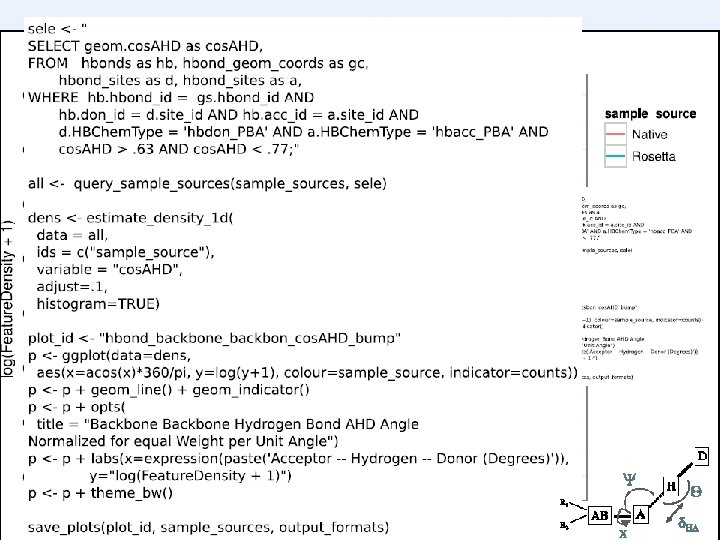 Our computational models Abstraction: A simple component of a complex computational model consists of: � One or more sample sources giving � � Observable local features having a � � Hydrogen bond distances and angles Chosen functional form that � � Pdb files from native or decoys Energy from distances and angles Depends on fitting parameters � Weights for combining terms KMB’ 03