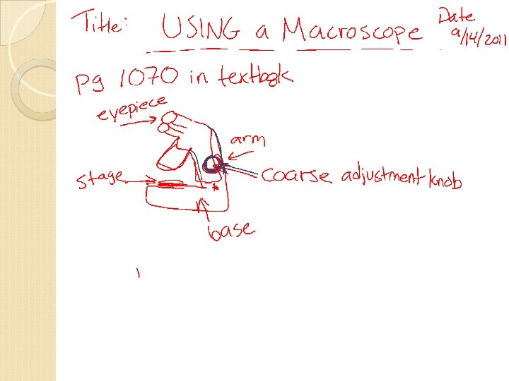 14/15 Sept 2011 Pick up: a copy of “Using a Macroscope”, Lab Safety Agreement, and your lab book. Begin reading the Lab Safety Agreement Title a new lab entry “Using a Macroscope” Follow directions for Using a Macroscope Lab.