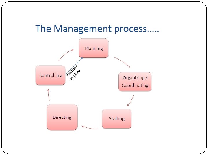 �Management as a Process � • Management refers to a series of inter-related functions or elements to achieve the stated objectives through the effective utilisation of human and other resources. �Management Process � • Planning �– To take decisions and to prepare plans, policies, procedures, rules, etc. � • Organising – Division on work and authority – responsibility � • Staffing – Deployment of workforce � • Directing – Instructing, motivating, leading the subordinates � • Controlling – Actual vis-à-vis standards and taking corrective measures.