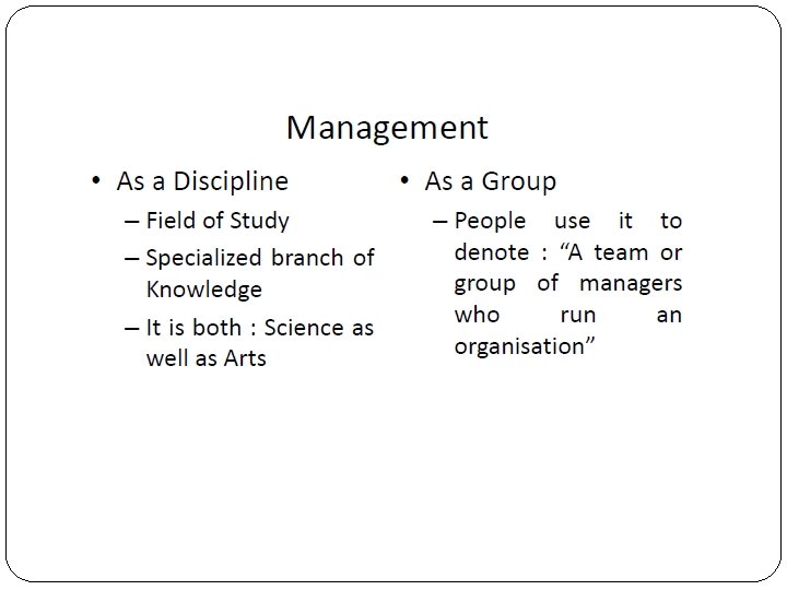 � Modern Definition � • Effective Utilisation of Resources � • Management is the creation and maintenance of an internal environment in an enterprise where individuals, working in groups, can perform efficiently and effectively towards the attainment of organisational goals. - Koontz and Weihrich � • Management entails the utilisation of human efforts and material resources towards the achievement of organisational objectives - B. M. Richman � Elements � • Process � – Primary Functions or activities that management performs to get things done i. e. Planning, Organising, Staffing, Directing & Controlling � • Effectiveness – Finishing the assigned task � • Efficiency – Optimum utilisation of the deployed resources � • Organisational Objectives – Synergied efforts of all towards the Org. Objectives.